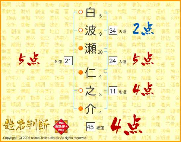 白(5画)波(9画)瀬(20画) 仁(4画)之(3画)介(4画)