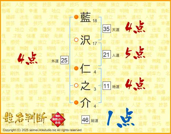 藍(18画)沢(17画) 仁(4画)之(3画)介(4画)