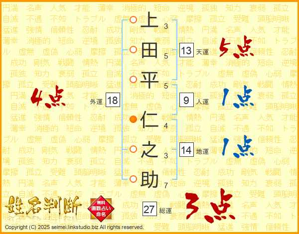 上(3画)田(5画)平(5画) 仁(4画)之(3画)助(7画)