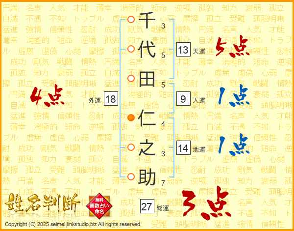 千(3画)代(5画)田(5画) 仁(4画)之(3画)助(7画)