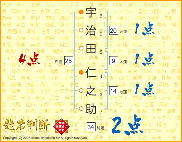 宇(6画)治(9画)田(5画) 仁(4画)之(3画)助(7画)