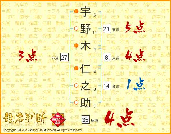 宇(6画)野(11画)木(4画) 仁(4画)之(3画)助(7画)