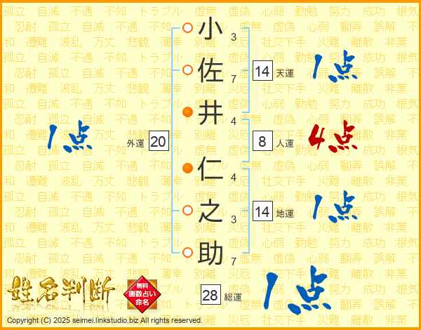 小(3画)佐(7画)井(4画) 仁(4画)之(3画)助(7画)