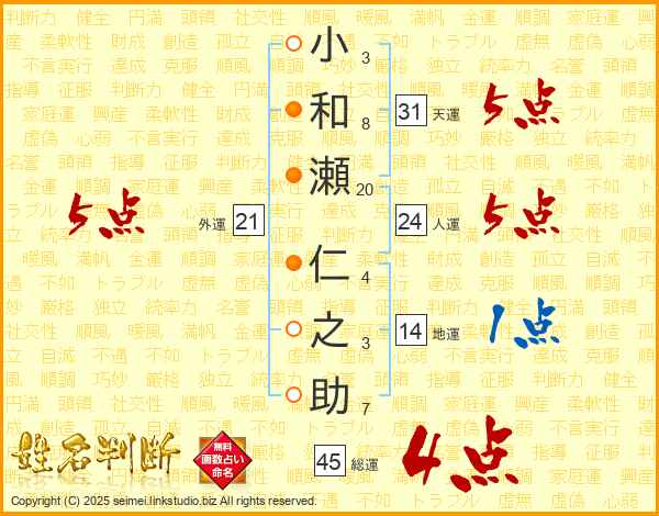 小(3画)和(8画)瀬(20画) 仁(4画)之(3画)助(7画)