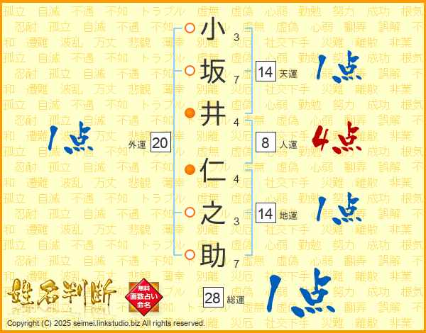 小(3画)坂(7画)井(4画) 仁(4画)之(3画)助(7画)