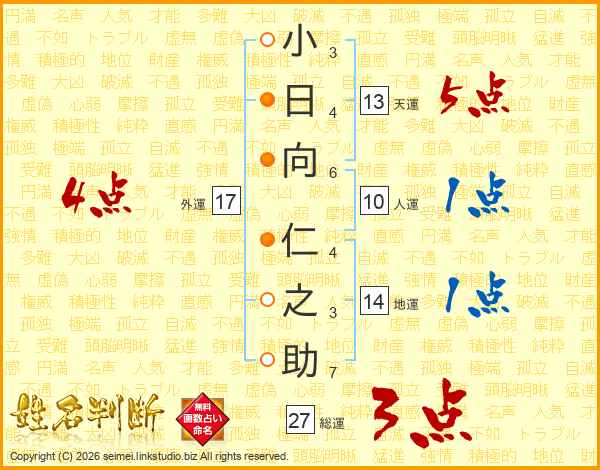 小日向仁之助さんの総運は27画の3点!