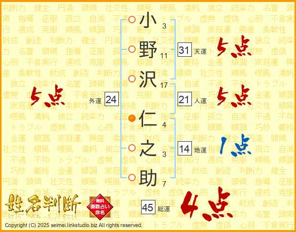 小野沢仁之助さんの総運は45画の4点!