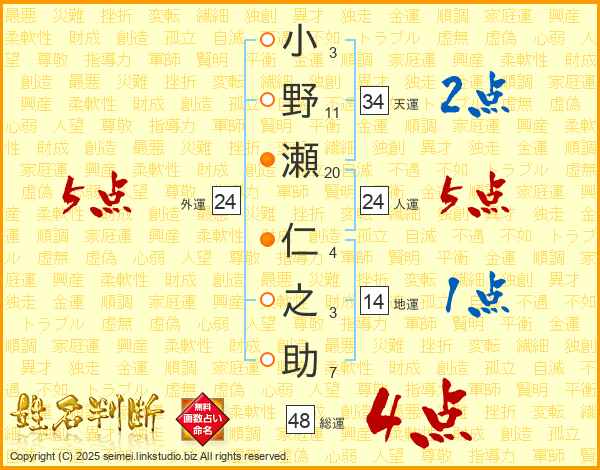 小(3画)野(11画)瀬(20画) 仁(4画)之(3画)助(7画)