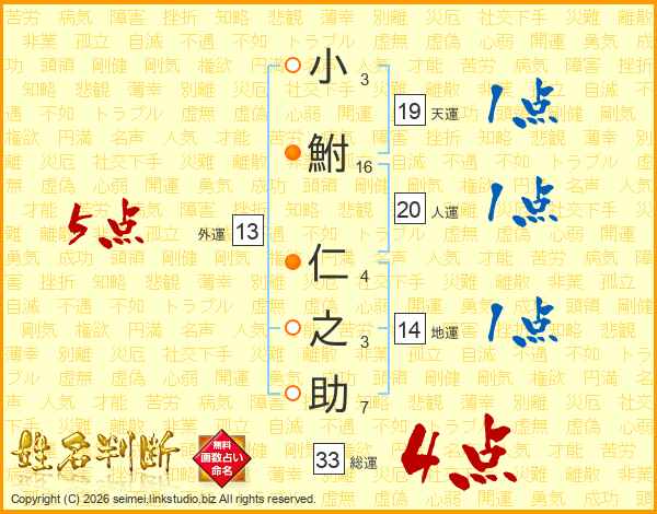 小鮒仁之助さんの総運は33画の4点!