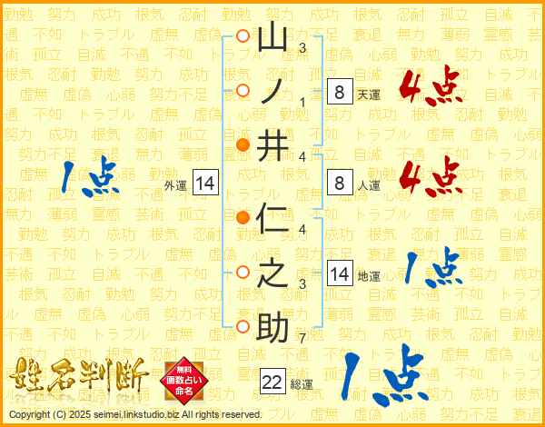 山(3画)ノ(1画)井(4画) 仁(4画)之(3画)助(7画)
