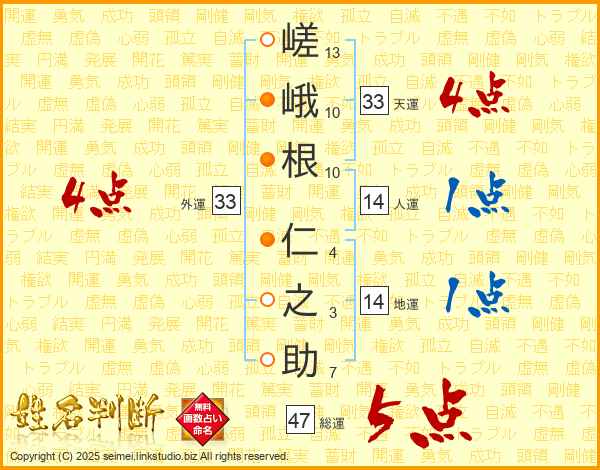 嵯峨根仁之助さんの総運は47画の5点!