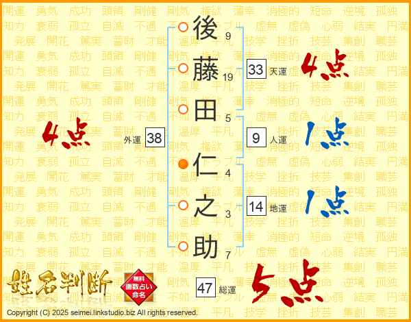 後(9画)藤(19画)田(5画) 仁(4画)之(3画)助(7画)