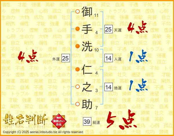御(11画)手(4画)洗(10画) 仁(4画)之(3画)助(7画)