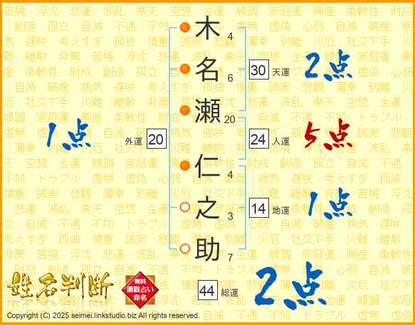 木(4画)名(6画)瀬(20画) 仁(4画)之(3画)助(7画)