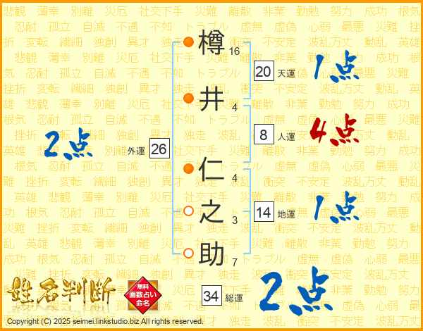 樽井仁之助さんの総運は34画の2点!