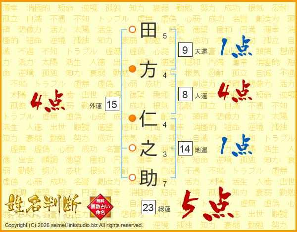 田(5画)方(4画) 仁(4画)之(3画)助(7画)