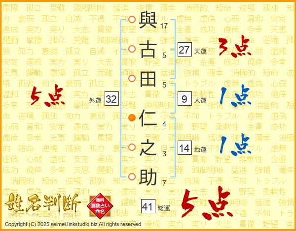 與(17画)古(5画)田(5画) 仁(4画)之(3画)助(7画)
