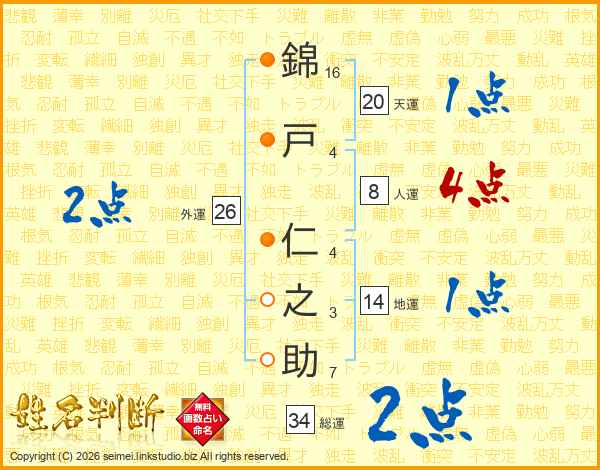 錦(16画)戸(4画) 仁(4画)之(3画)助(7画)