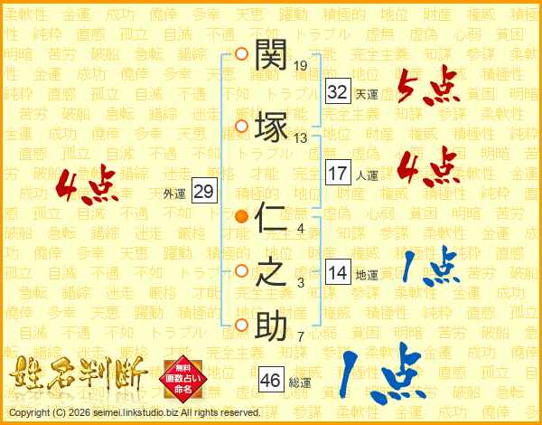 関(19画)塚(13画) 仁(4画)之(3画)助(7画)