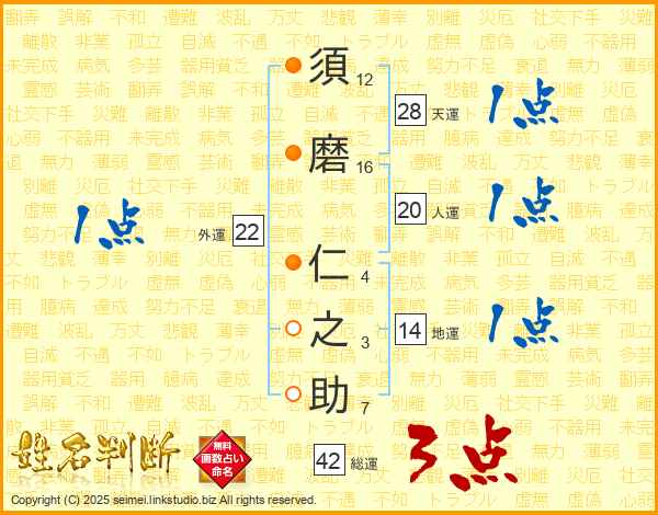 須(12画)磨(16画) 仁(4画)之(3画)助(7画)