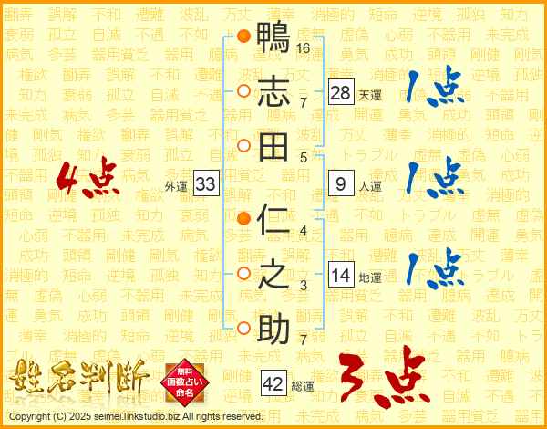 鴨(16画)志(7画)田(5画) 仁(4画)之(3画)助(7画)