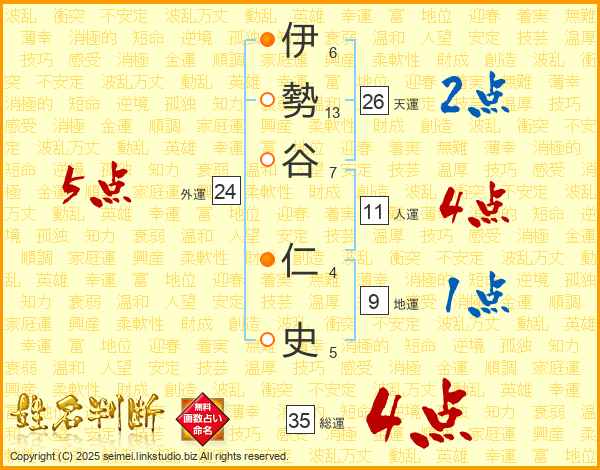 伊(6画)勢(13画)谷(7画) 仁(4画)史(5画)