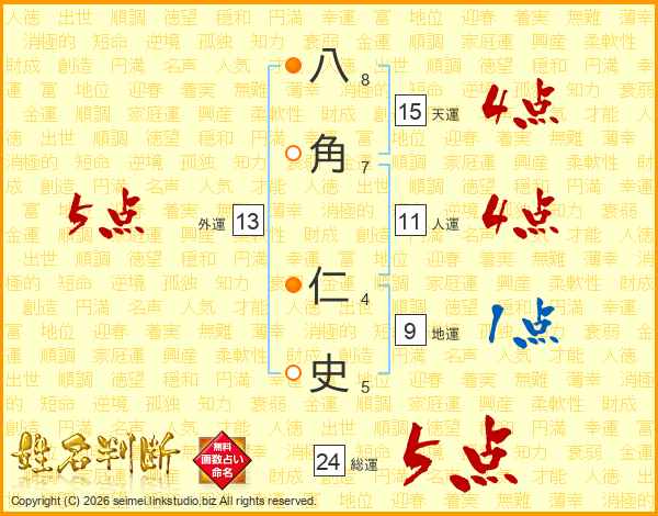 あなたの人生を表す1番重要な運勢です。生涯を通じて影響する総合運となり、主に50歳以降の晩年期に影響を及ぼします。苗字と名前の合計画数。