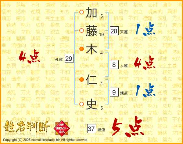 加(5画)藤(19画)木(4画) 仁(4画)史(5画)