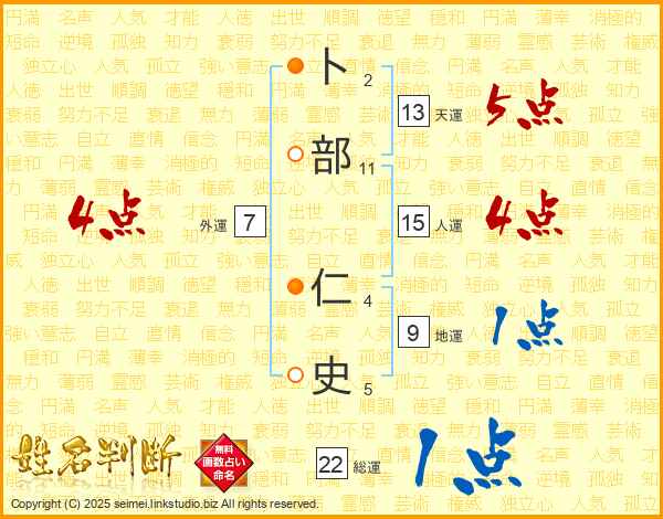 生活面を象徴する運勢です。外部から受ける影響力を表し、結婚運、家庭運や職場、環境への順応性を表します。総運から人運を引いた画数。姓や名が1文字の場合を除く。