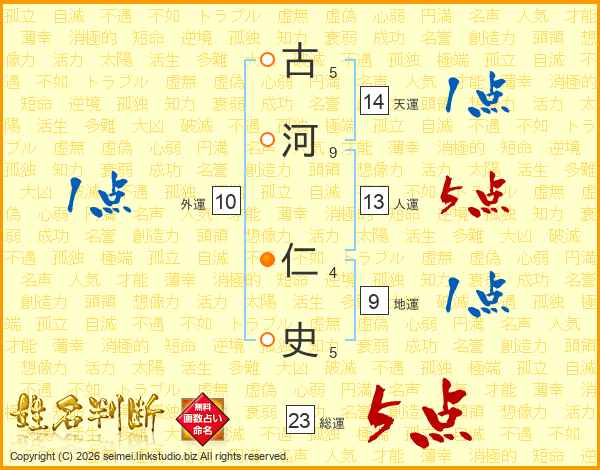 画数の奇数(○陽)と偶数(●陰)の配列で吉凶を占います。どちらかにかたよる名前は大凶名で避ける必要があります。画数の奇数偶数。