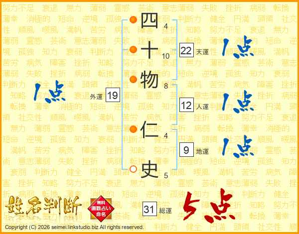 四十物仁史さんの総運は31画の5点!