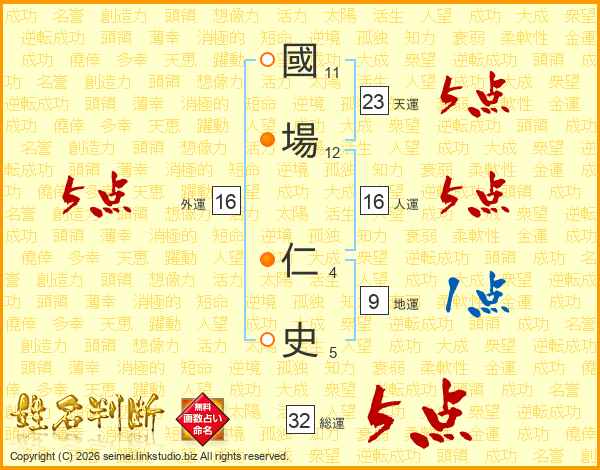 あなたの人生を表す1番重要な運勢です。生涯を通じて影響する総合運となり、主に50歳以降の晩年期に影響を及ぼします。苗字と名前の合計画数。