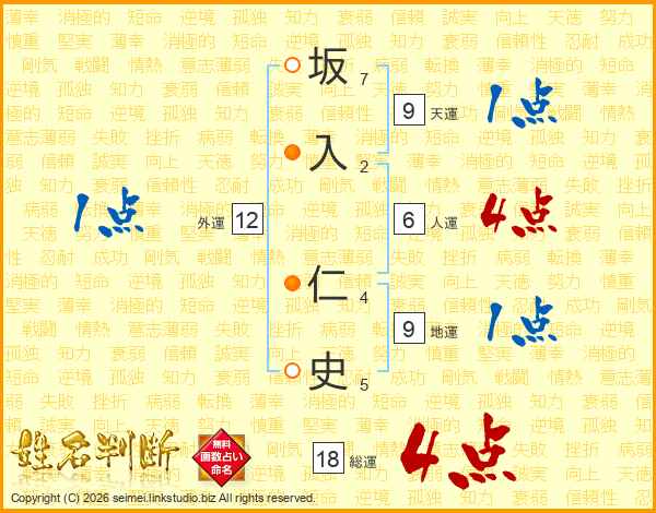 坂(7画)入(2画) 仁(4画)史(5画)