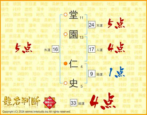 堂(11画)園(13画) 仁(4画)史(5画)