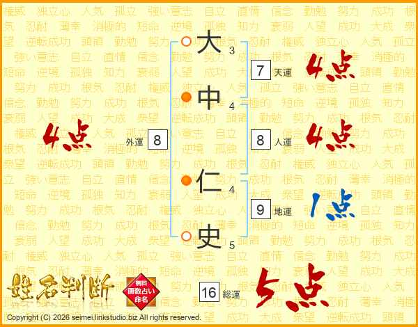 あなたの人生を表す1番重要な運勢です。生涯を通じて影響する総合運となり、主に50歳以降の晩年期に影響を及ぼします。苗字と名前の合計画数。
