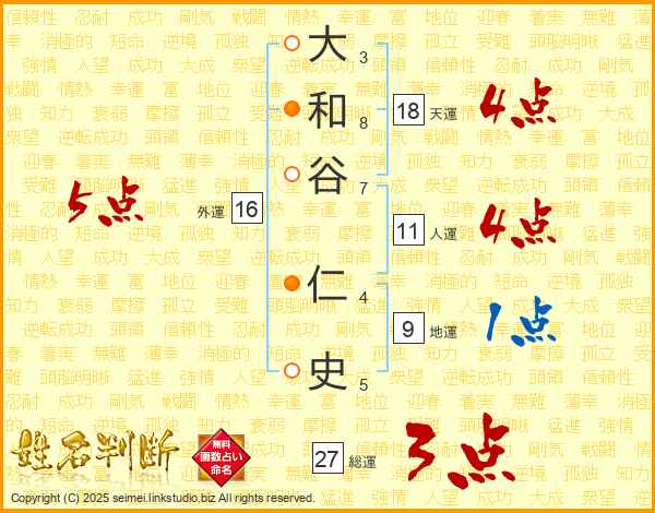 大(3画)和(8画)谷(7画) 仁(4画)史(5画)
