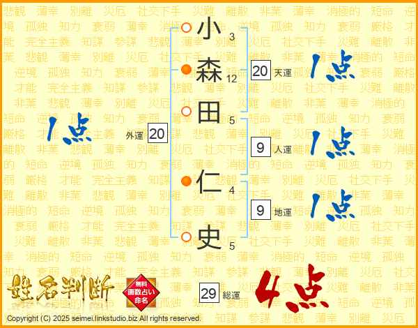 小(3画)森(12画)田(5画) 仁(4画)史(5画)