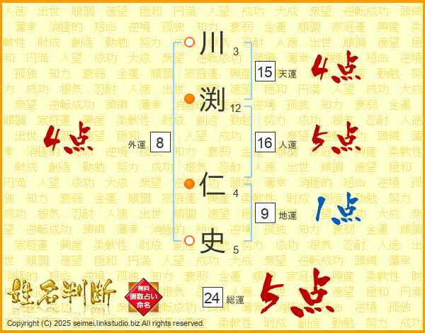 あなたの人生を表す1番重要な運勢です。生涯を通じて影響する総合運となり、主に50歳以降の晩年期に影響を及ぼします。苗字と名前の合計画数。