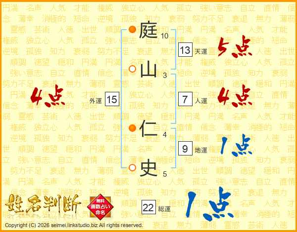 庭(10画)山(3画) 仁(4画)史(5画)
