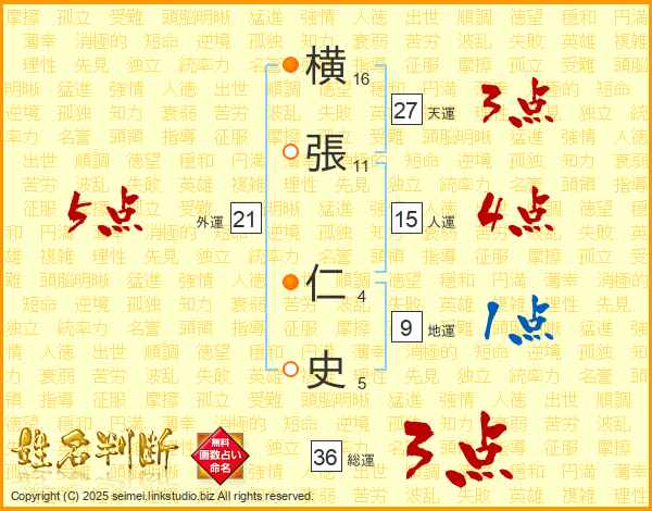 あなたの人生を表す1番重要な運勢です。生涯を通じて影響する総合運となり、主に50歳以降の晩年期に影響を及ぼします。苗字と名前の合計画数。