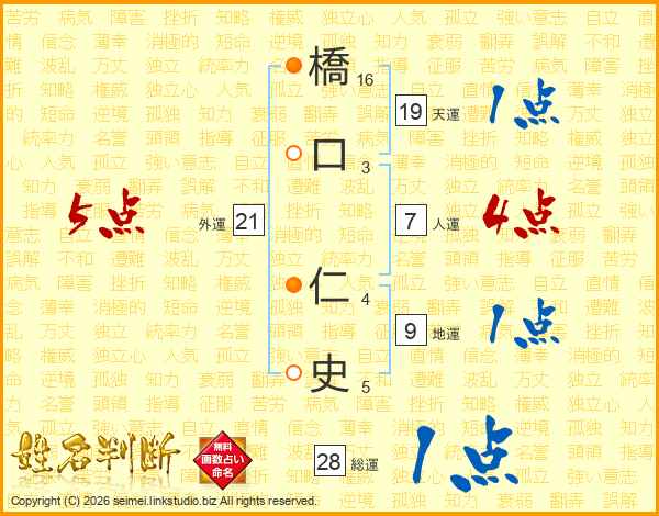 あなたの人生を表す1番重要な運勢です。生涯を通じて影響する総合運となり、主に50歳以降の晩年期に影響を及ぼします。苗字と名前の合計画数。