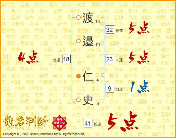 渡(13画)邉(19画) 仁(4画)史(5画)