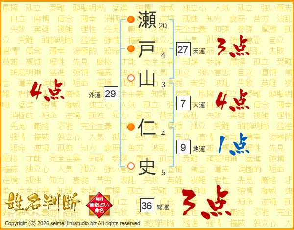 瀬(20画)戸(4画)山(3画) 仁(4画)史(5画)