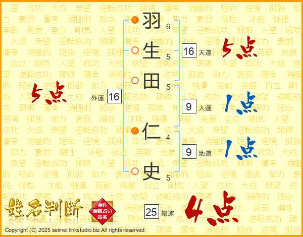 羽(6画)生(5画)田(5画) 仁(4画)史(5画)
