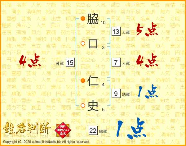 脇(10画)口(3画) 仁(4画)史(5画)