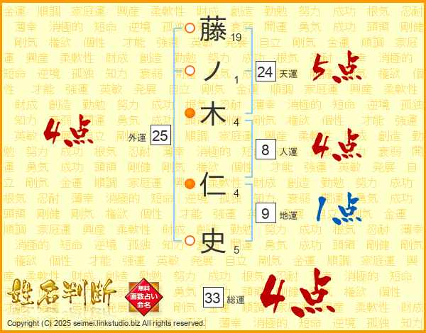 藤(19画)ノ(1画)木(4画) 仁(4画)史(5画)