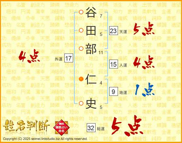 谷(7画)田(5画)部(11画) 仁(4画)史(5画)