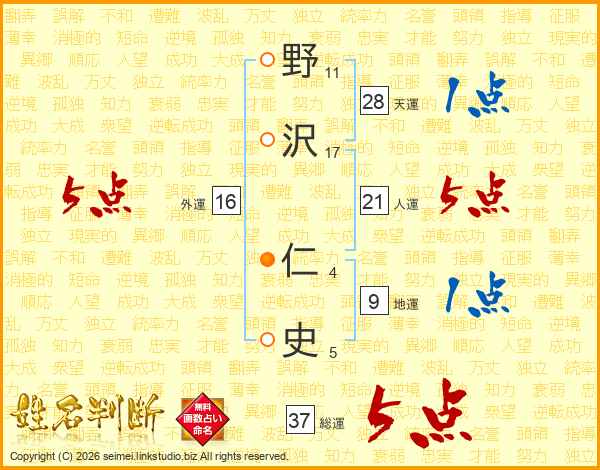 生活面を象徴する運勢です。外部から受ける影響力を表し、結婚運、家庭運や職場、環境への順応性を表します。総運から人運を引いた画数。姓や名が1文字の場合を除く。