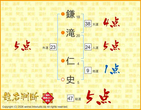鎌(18画)滝(20画) 仁(4画)史(5画)