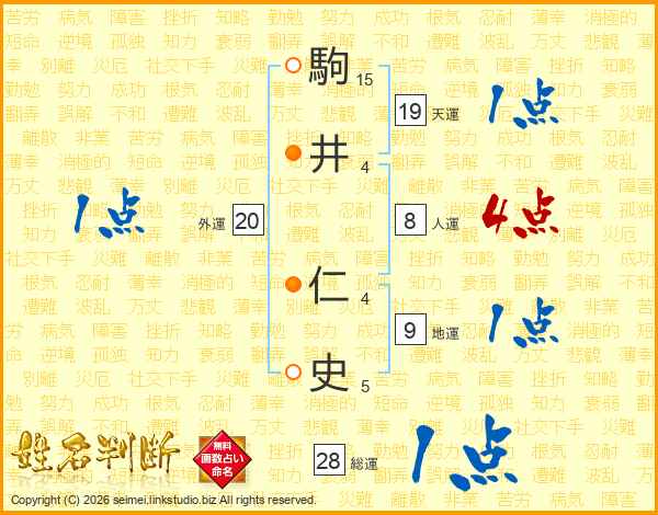 駒(15画)井(4画) 仁(4画)史(5画)